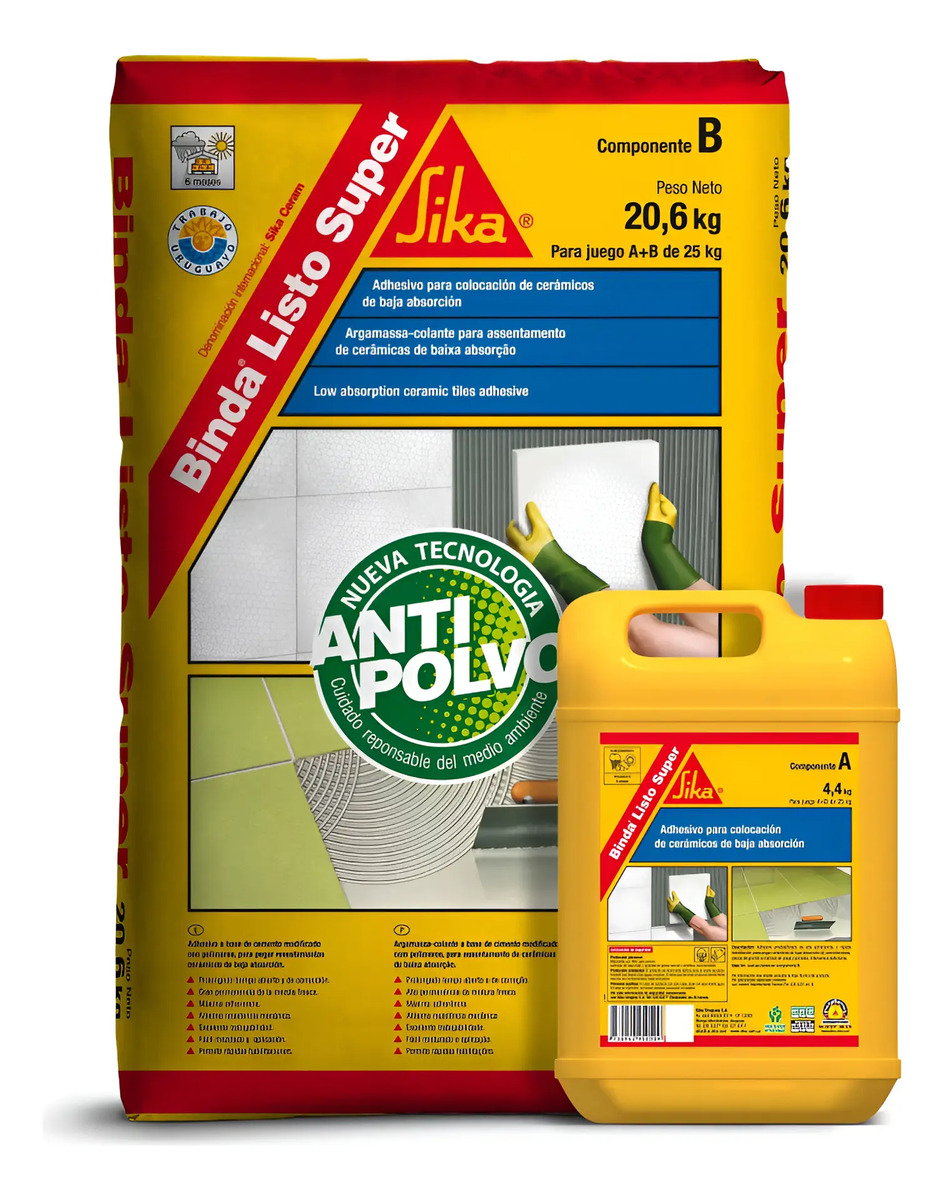 Adhesivo Cementicio Máxima Adherencia Sika Binda Listo Super’ es un adhesivo cementicio predosificado de dos componentes. Es perfecto para pegar cerámicos sobre cerámicos, en piscinas, losa radiante y para múltiples usos.