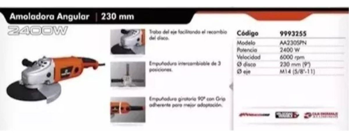 Amoladora Angular de 230mm con traba de eje para facilitar el recambio de disco. Empuñadura lateral intercambiable en 3 posiciones y sistema de ventilación frontal. Empuñadura giratoria 90º con grip adherente para mejor adaptación.