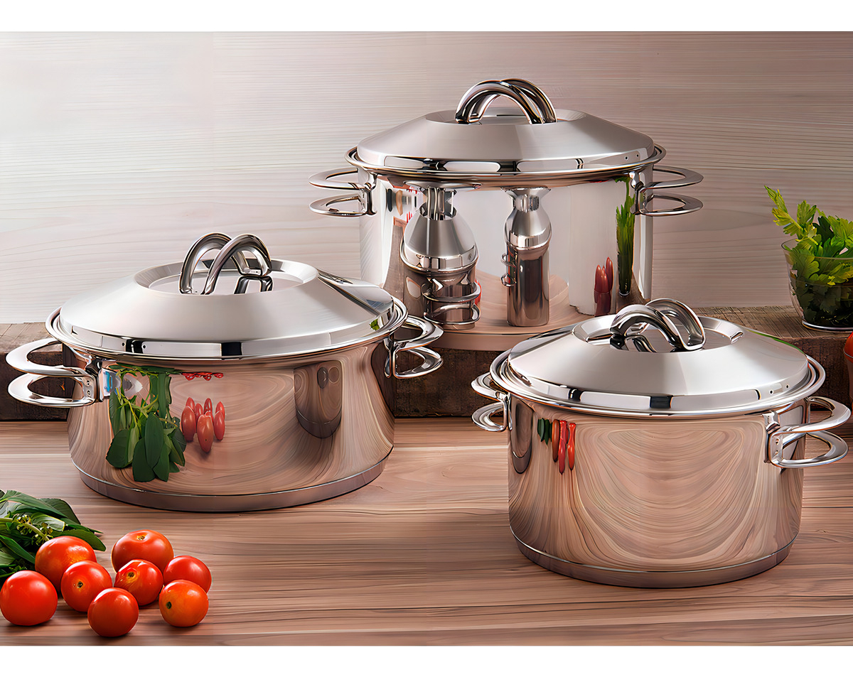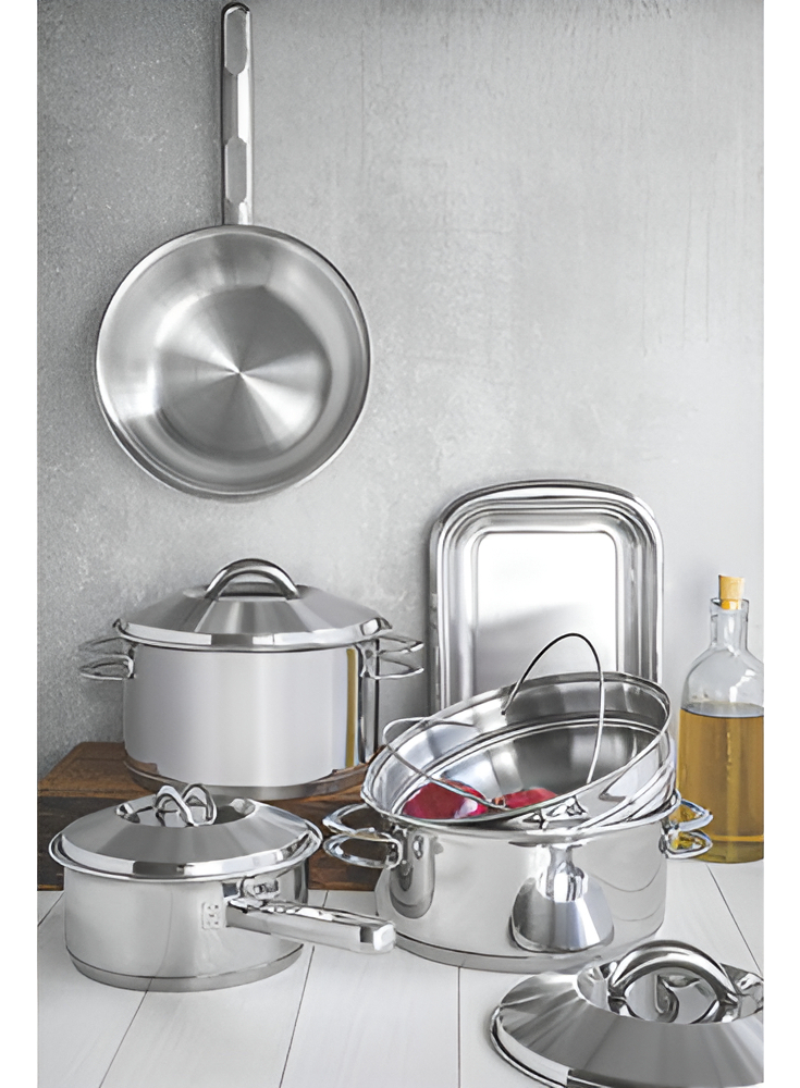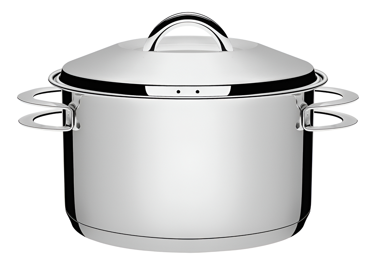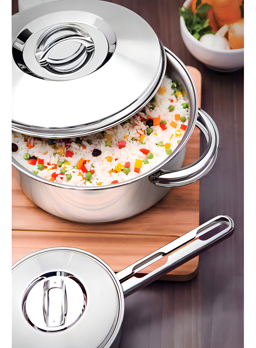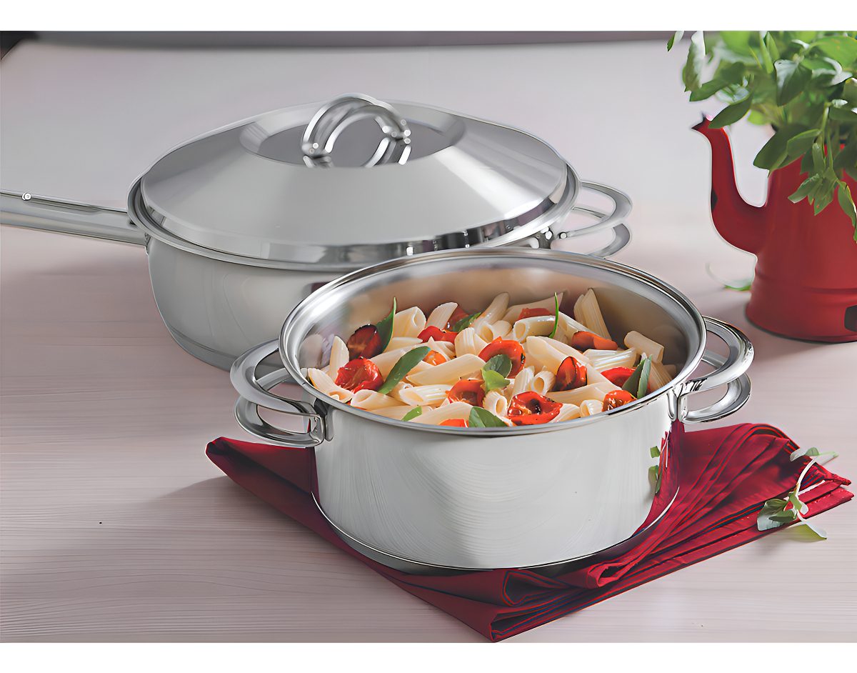Debido a que está hecha de acero inoxidable, la cazuela no deja residuos en las recetas. Práctica para todas las recetas, apta para su uso en cocinas de gas, eléctricas, vitrocerámicas y de inducción. Tiene una tapa con salida de vapor y un ajuste perfecto. El acero inoxidable es resistente y duradero. El triple fondo distribuye el calor de manera uniforme, lo que permite cocinar más rápido y ahorrar energía. La cazuela se puede hornear para gratinar o terminar los platos, soportando hasta 260 °C. Fácil de limpiar, se puede lavar con agua, jabón y una esponja suave o en la lavadora.