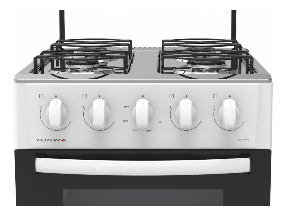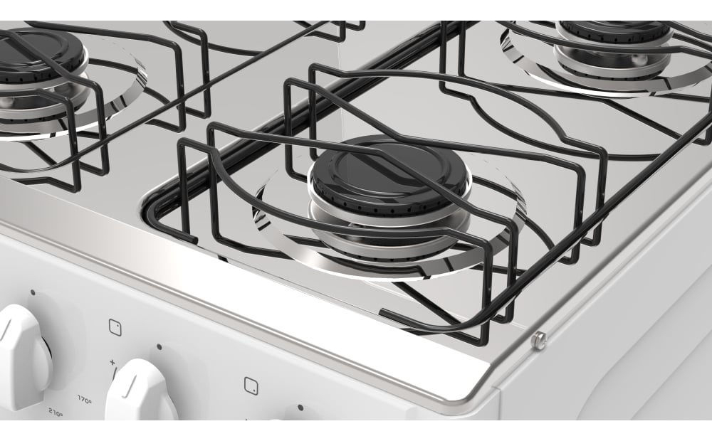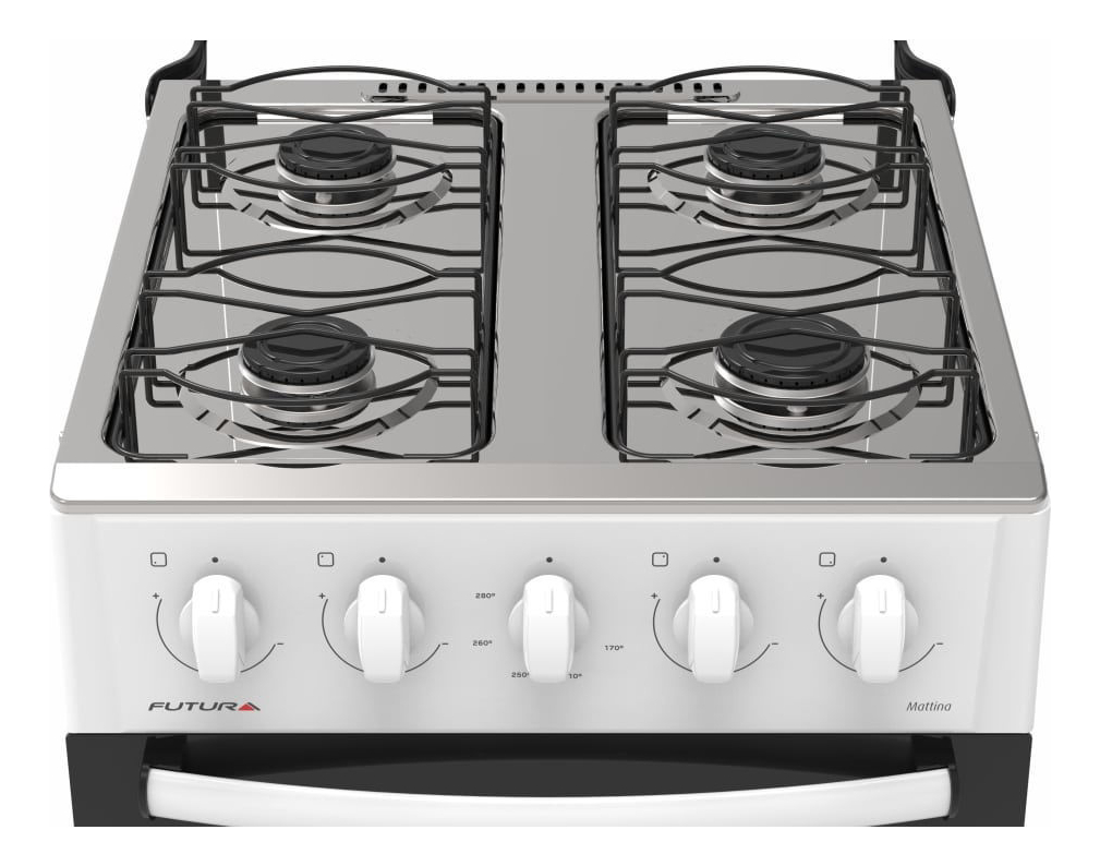 • 4 quemadores a gas o supergas, con tapas enlozadas y esparcidor en acero inoxidable.