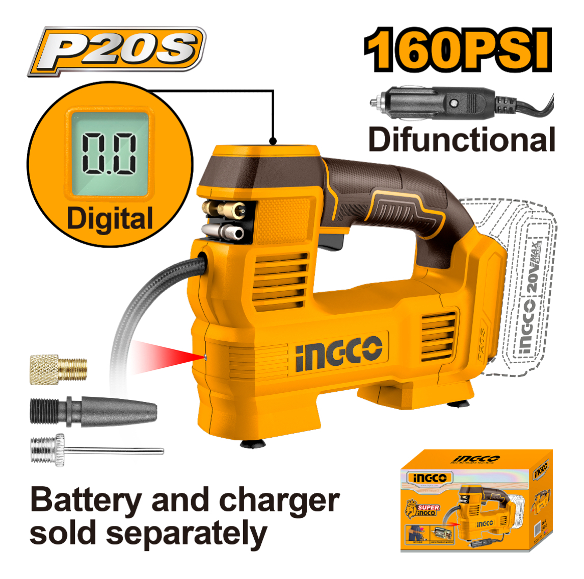 Descubre el Compresor de Aire a Batería Ingco, un equipo compacto y portátil que te ofrece una solución eficiente para inflar neumáticos, juguetes y más. Con un voltaje de 20V y una impresionante presión máxima de 160PSI (11BAR), este compresor es ideal para diversas aplicaciones. Su caudal de aire de 35L/min garantiza un inflado rápido y efectivo. Diseñado para ser ligero, con un peso de solo 3 kg, es fácil de transportar y almacenar. Incluye una luz de trabajo integrada para mayor comodidad en condiciones de poca luz, así como tres adaptadores y un tubo de aire para diferentes usos. Además, cuenta con un cable de 3 metros con encendedor de cigarrillos, lo que lo hace perfecto para usar en el automóvil. Ten en cuenta que la batería y el cargador se venden por separado, lo que te permite personalizar tu compra según tus necesidades.