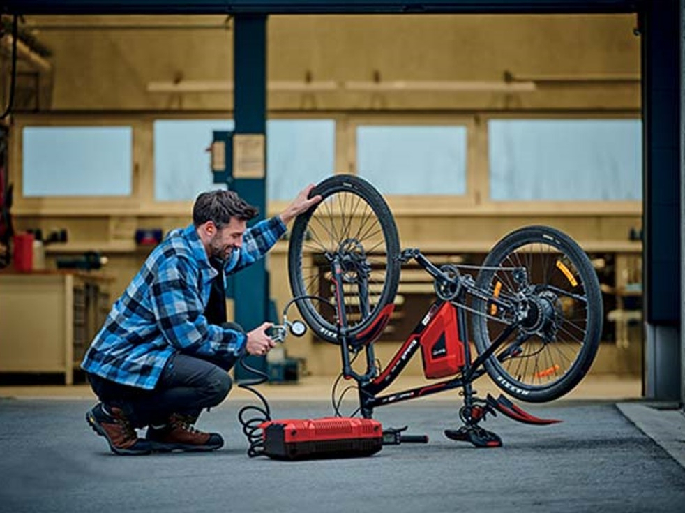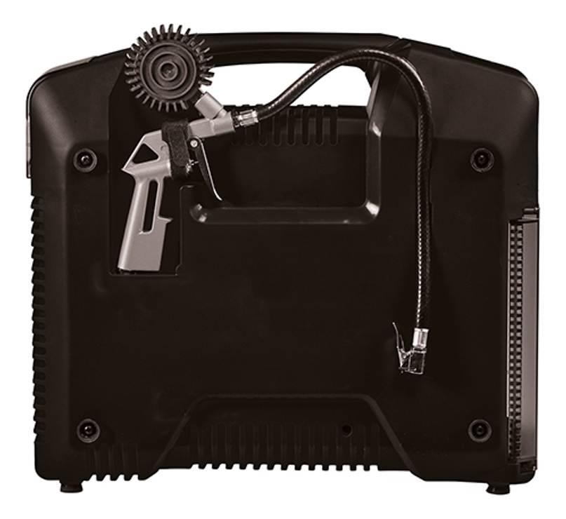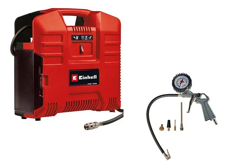 El compresor de maletín con batería TE-AC 36/8 Li OF Set-Solo de Einhell pertenece a la potente familia Power X-Change. Las baterías con celdas de iones de litio de alta calidad se pueden combinar con todos los miembros de la familia Power X-Change. El compresor de maletín con batería es un ayudante pequeño pero potente para aplicaciones hasta como máximo 8 bares. Por tanto, es adecuado p. ej. para el inflado rápido de neumáticos de bicicleta, coche y moto. Los exigentes neumáticos de bicicleta de carreras no suponen ningún problema al compresor de maletín con batería gracias a su potente bomba. El diseño ergonómico y una empuñadura práctica aportan movilidad y un transporte sencillo. La bomba exenta de aceite y servicio solo necesita un pequeño coste de mantenimiento. En la carcasa está integrado el compartimento de almacenamiento para la manguera de aire comprimido. Una caja de almacenamiento adicional está prevista para el adaptador. El inflador de neumáticos puede guardarse cómodamente en la carcasa En el alcance del envío están contenidos una manguera de aire comprimido de 2,5 m con acoplamiento rápido, un adaptador para el uso como pistola de soplado, un inflador de neumáticos y un set adaptador de 3 piezas. El envío se realiza sin batería ni cargador, son adquiribles por separado. Para el funcionamiento del compresor de maletín se necesitan 2 baterías de 18 V Power X-Change.