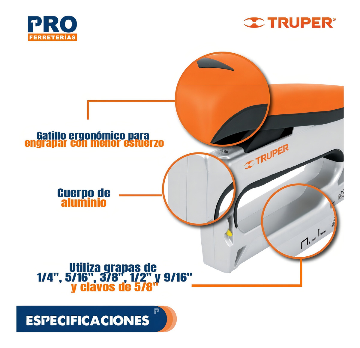 Medida de grapas 9/16” (14.2mm), 1/2” (12.7mm), 3/8” (9.5mm), 5/16”