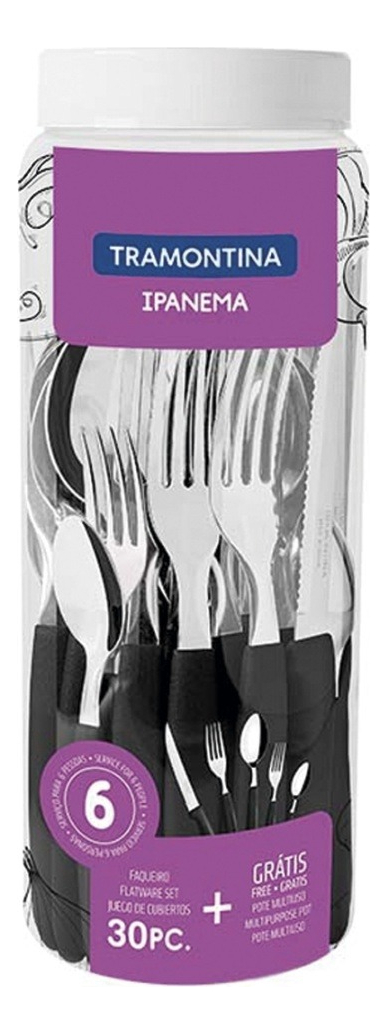 El diseño elegante y contemporáneo de los cubiertos Ipanema complementa cualquier decoración de mesa, mientras que su versatilidad los hace ideales para el uso diario o para ocasiones especiales. El set viene en un práctico pote multiuso, perfecto para almacenar y organizar tus cubiertos o incluso para utilizarlo en otras necesidades del hogar.