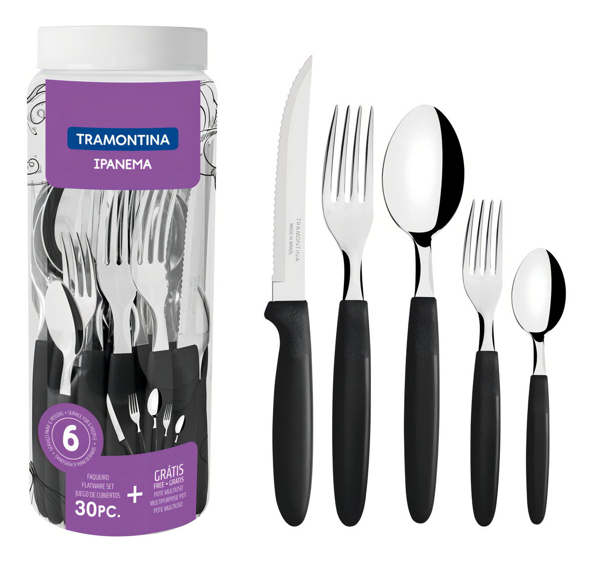 Eleva la elegancia de cada comida con el Juego de Cubiertos Tramontina Ipanema de 30 piezas en color negro. Este completo set incluye 6 cucharas para té, 6 cucharas soperas, 6 cuchillos jumbo, 6 tenedores de postre y 6 tenedores, asegurando que estés preparado para cualquier ocasión, desde un desayuno casual hasta una cena formal.