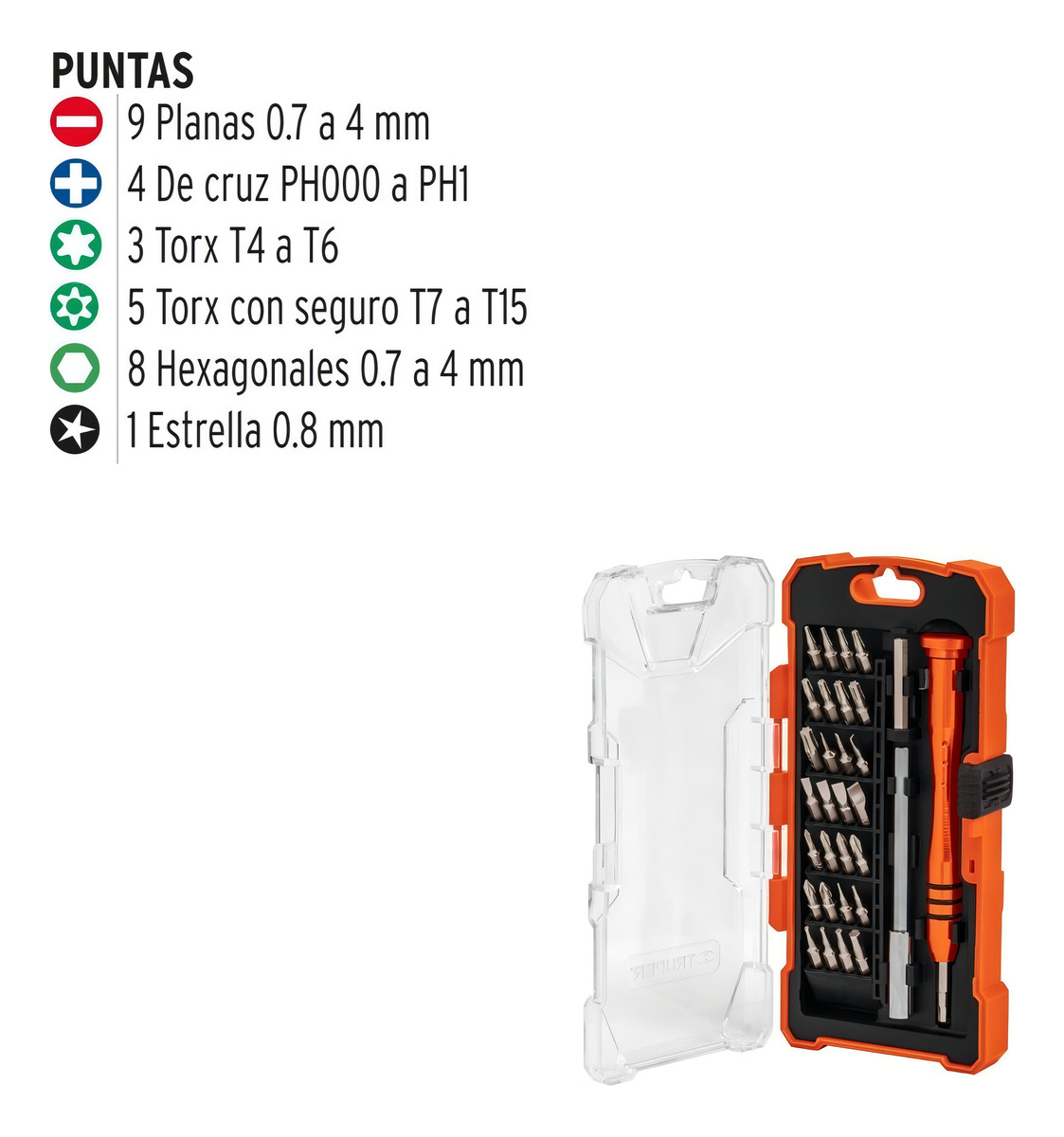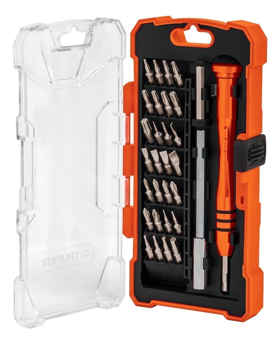 Juego de destornilladores de precisión con punta intercambiable, 32 piezas Truper. Las puntas están fabricadas de acero al cromo vanadio, lo que las hace 2X más resistentes al desgaste que las de acero al carbono. Incluye una extensión rígida y un porta puntas magnético. La cabeza es giratoria y el mango de aluminio. Ideal para trabajos en electrónica y de precisión.