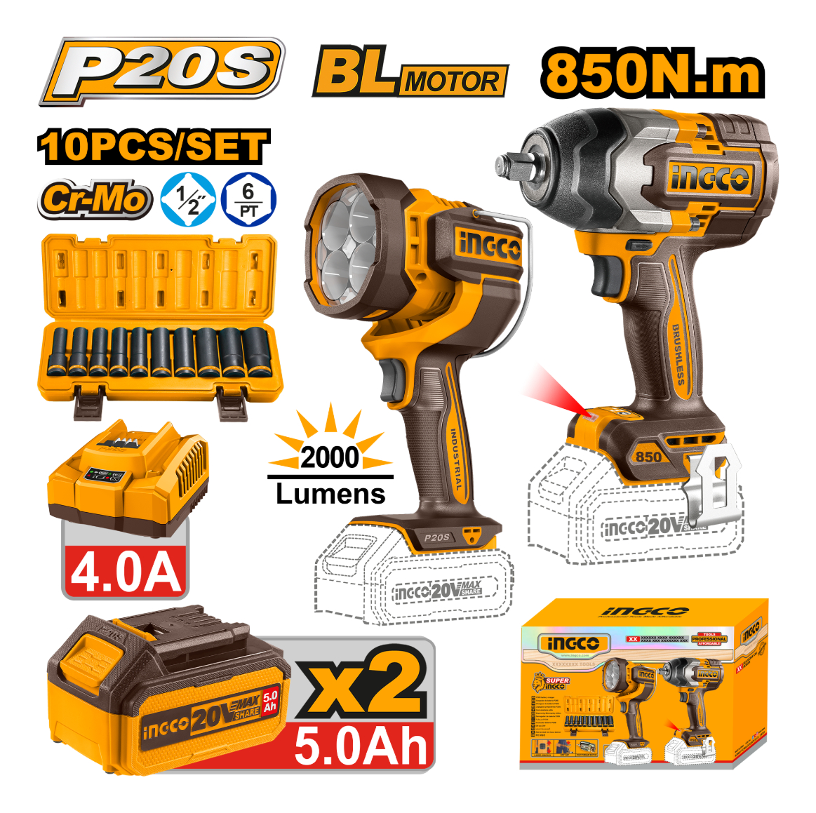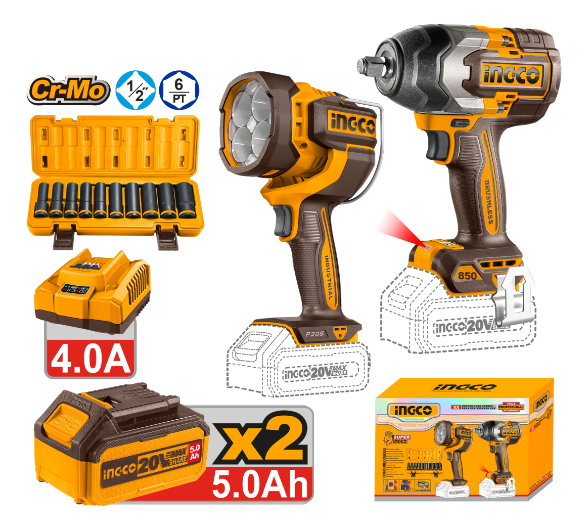KIT COMBO A BATERIA P20S 20V C/LLAVE DE IMPACTO + LINTERNA C/2 BATERIAS, CARGADOR + SET 10 DADOS 1/2″