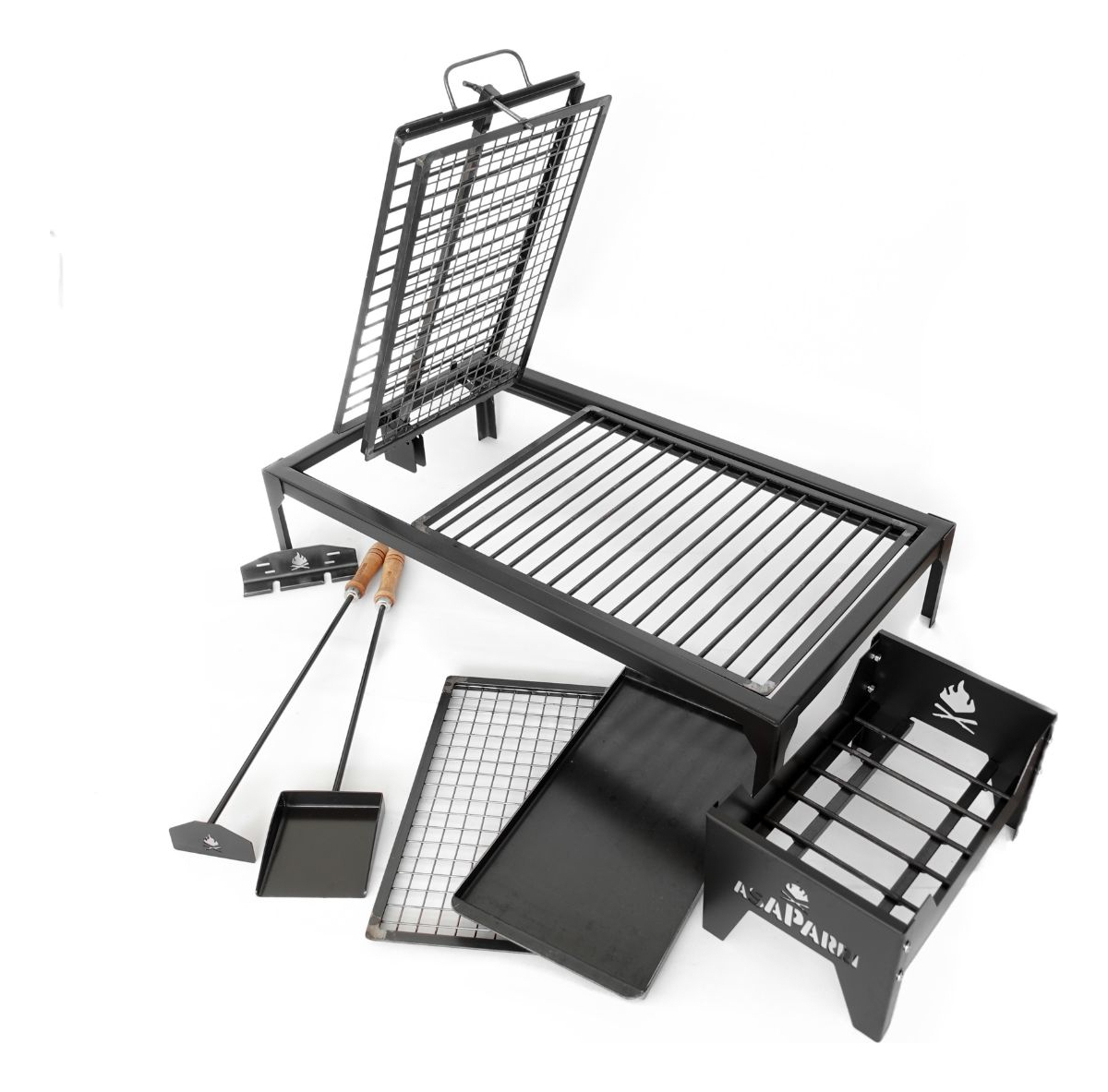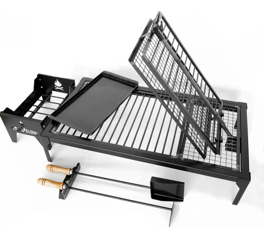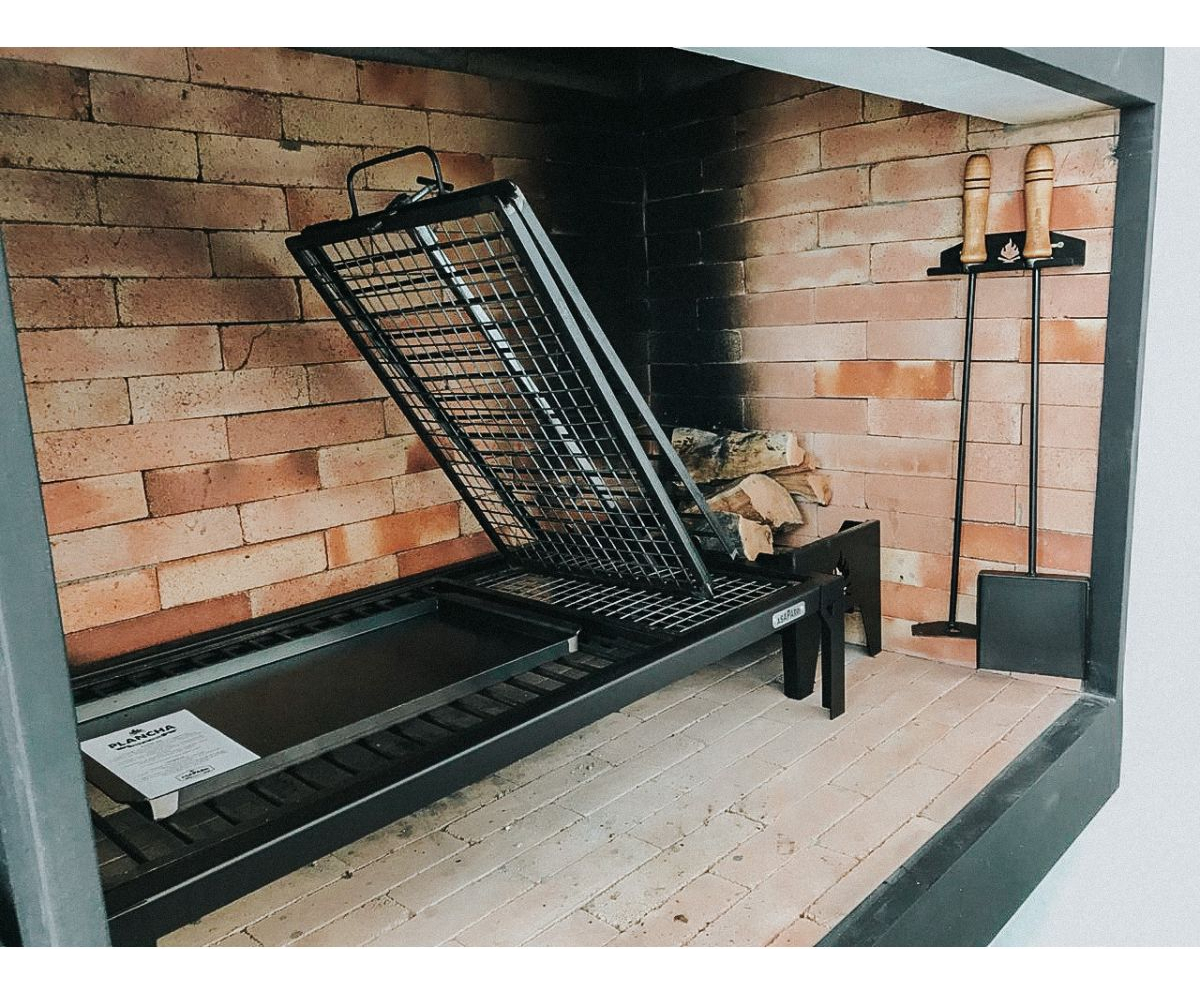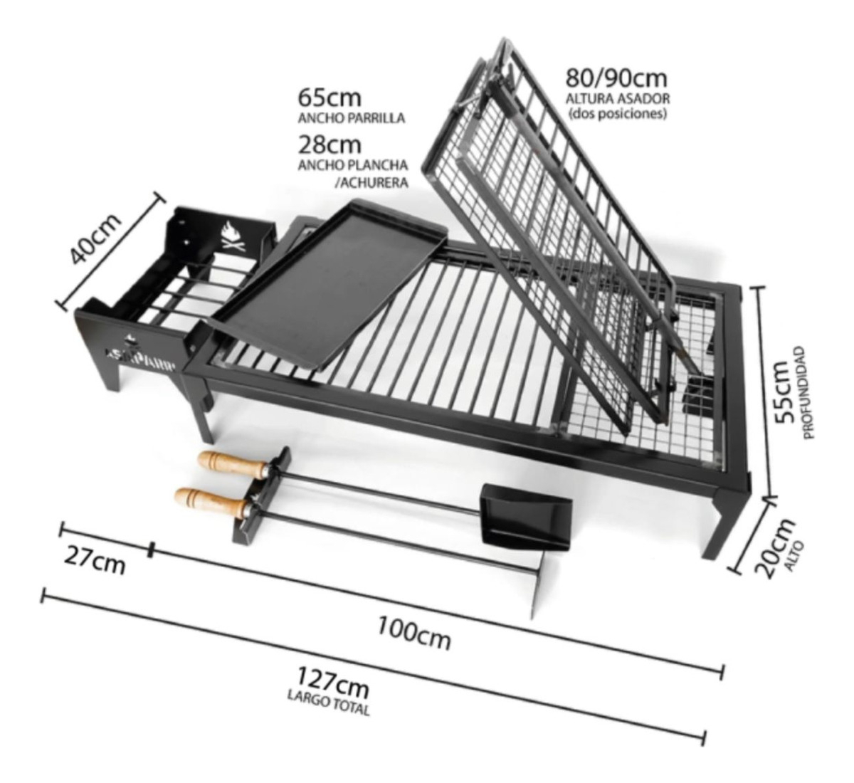 Incluye: base, parrilla (dividida en dos), asador (soporte incluido en la base). Brasero, plancha, palita y atizador (con soporte para la pared).