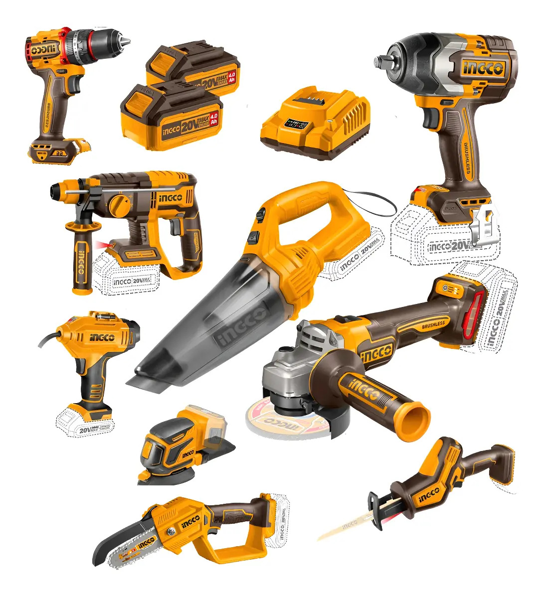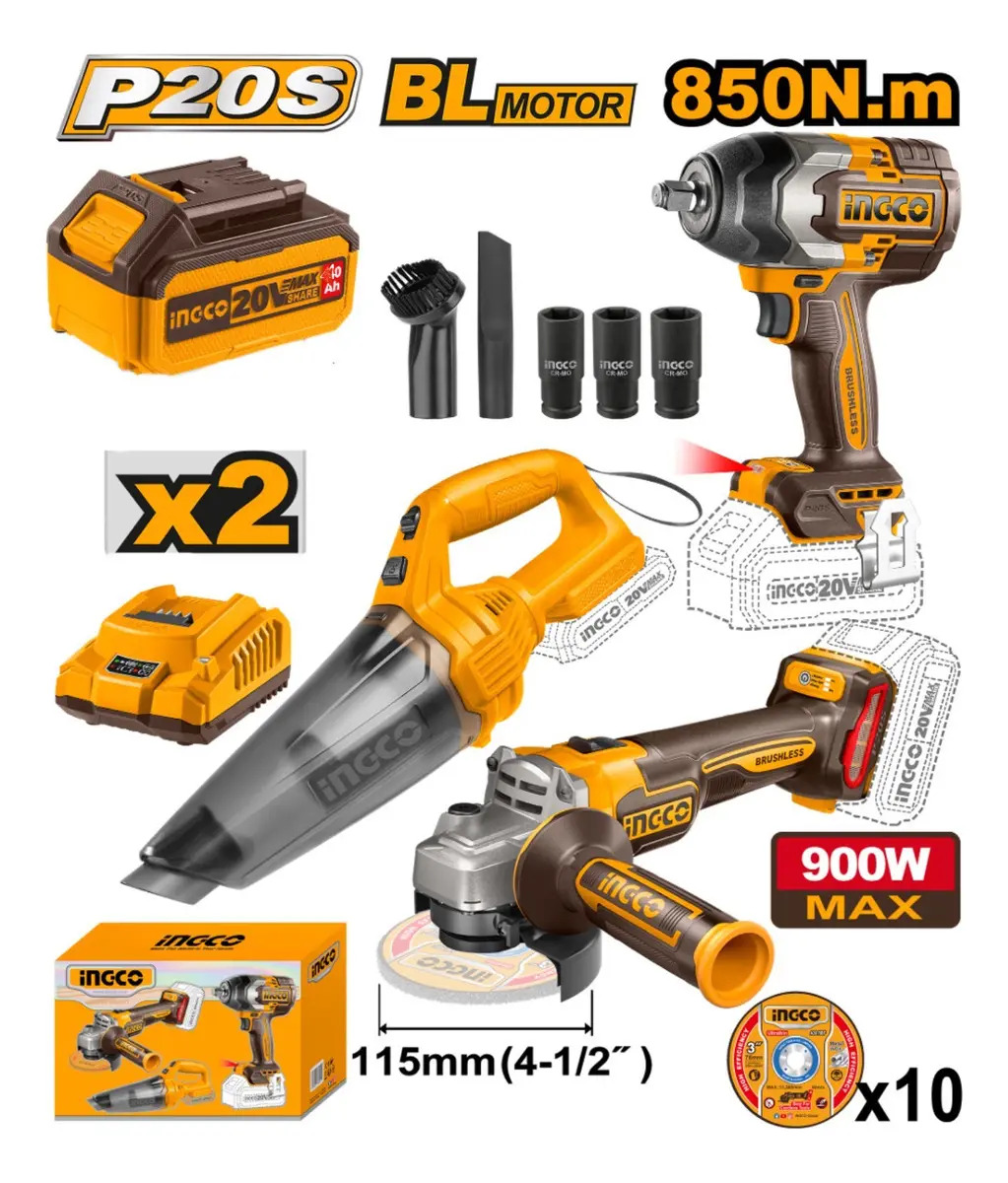 Kit Combo 9 Herramientas 20v Llave 850nm 2 Baterías Ingco Ub
