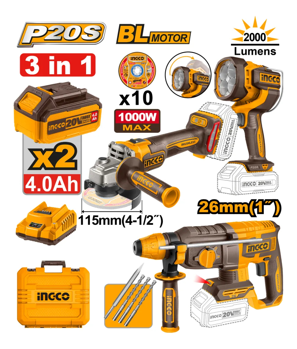 KIT COMBO A BATERIA P20S ROTOMARTILLO 26MM 1″ SDS PLUS + AMOLADORA ANGULAR 4½» 115MM + LINTERNA 2000 LUMENS + 2BAT 4.0AH + CARGADOR + ACCESORIOS + VALIJA
