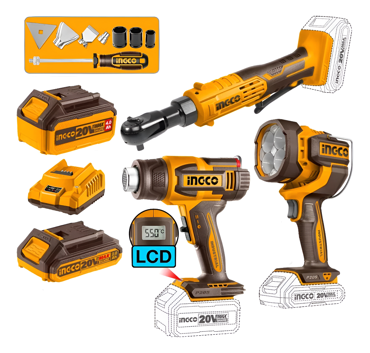 KIT COMBO A BATERIA P20S 20V LLAVE CRIQUE + PISTOLA DE CALOR + LINTERNA C/2 BATERIAS, CARGADOR Y ACCESORIOS