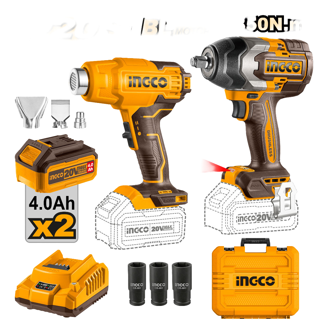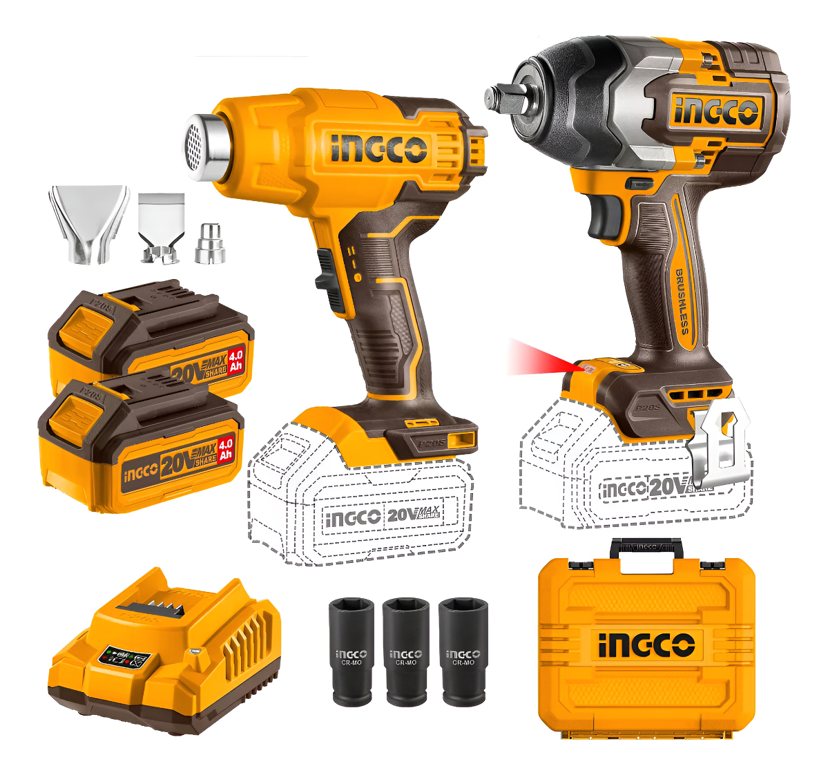 COMBO LLAVE DE IMPACTO A BATERIA 1/2″ 850NM 20V P20S BRUSHLESS + PISTOLA DE CALOR A BATERIA 20V P20S BRUSHLESS EN VALIJA C/2 BAT