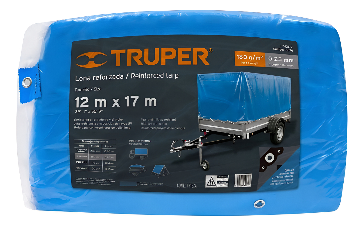 La Lona Uso Rudo Reforzada de la marca Truper es el producto perfecto para proteger tus objetos de valor de las inclemencias del clima. Con un tamaño de 12 x 17 metros y un atractivo color azul, esta lona es ideal para cubrir grandes áreas y brindar una protección duradera. Su resistencia al agua garantiza que tus pertenencias se mantengan secas incluso en los días más lluviosos. Además, cuenta con protección UV, lo que evita que los rayos solares dañen el material y prolonga su vida útil. No pierdas la oportunidad de adquirir esta lona de alta calidad y asegurar la protección de tus objetos más preciados.