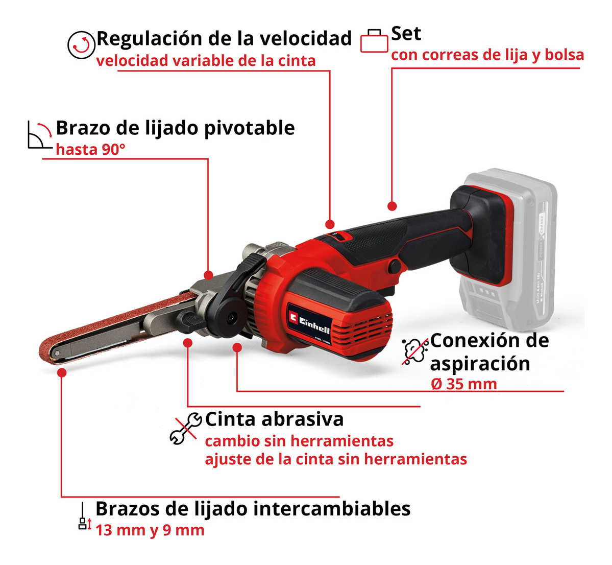 Ajuste de la cinta lijadora sin herramientas directamente en el brazo lijador