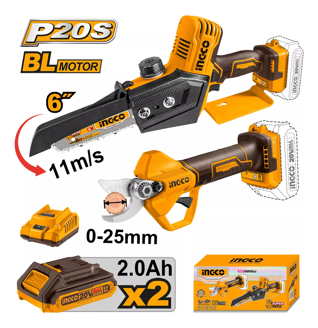 Mini Motosierra + Tijera Poda 20v + 2 Baterias Ingco Cosli24