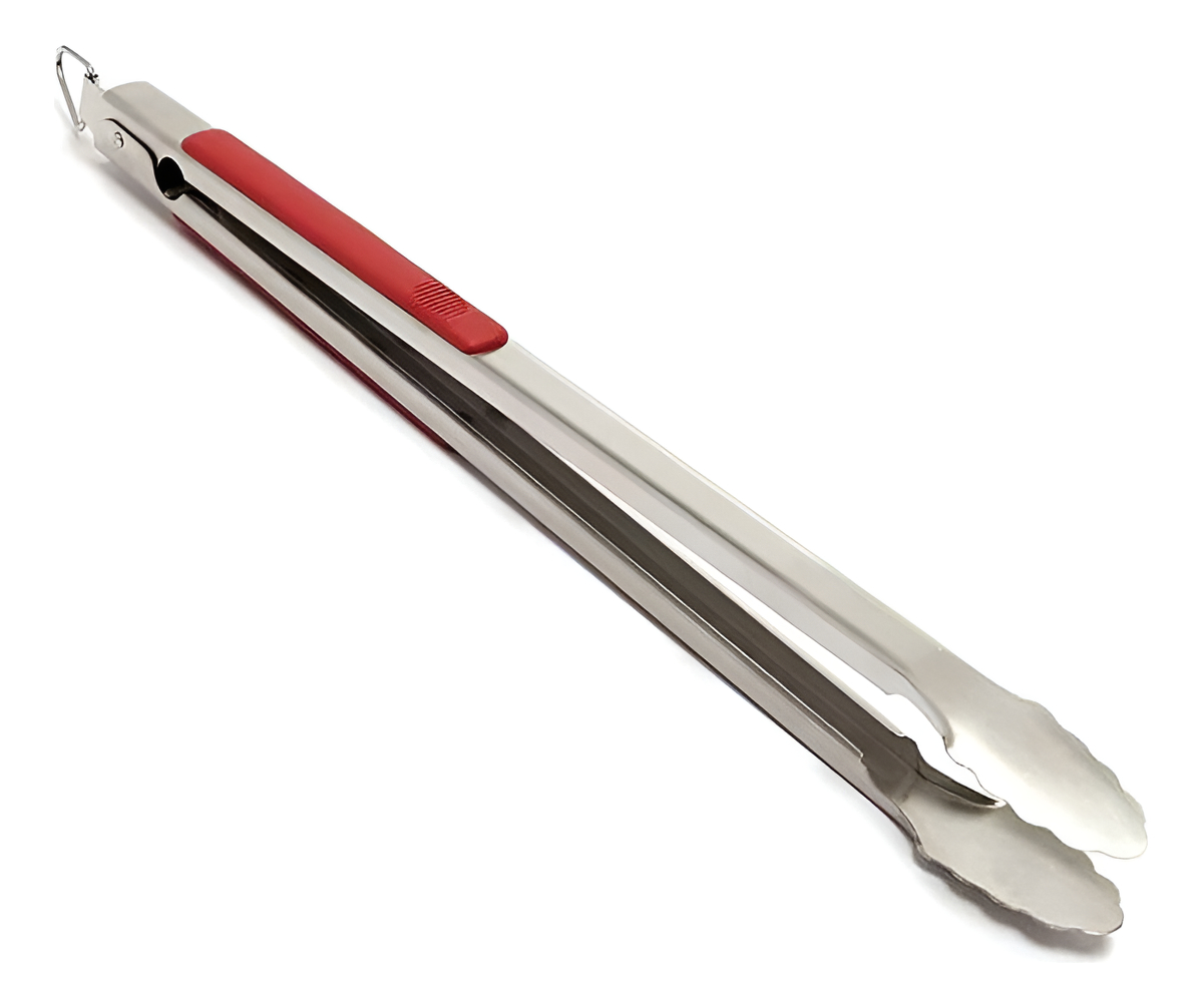 Pinza larga de acero inoxidable para parrilla con mango de goma.