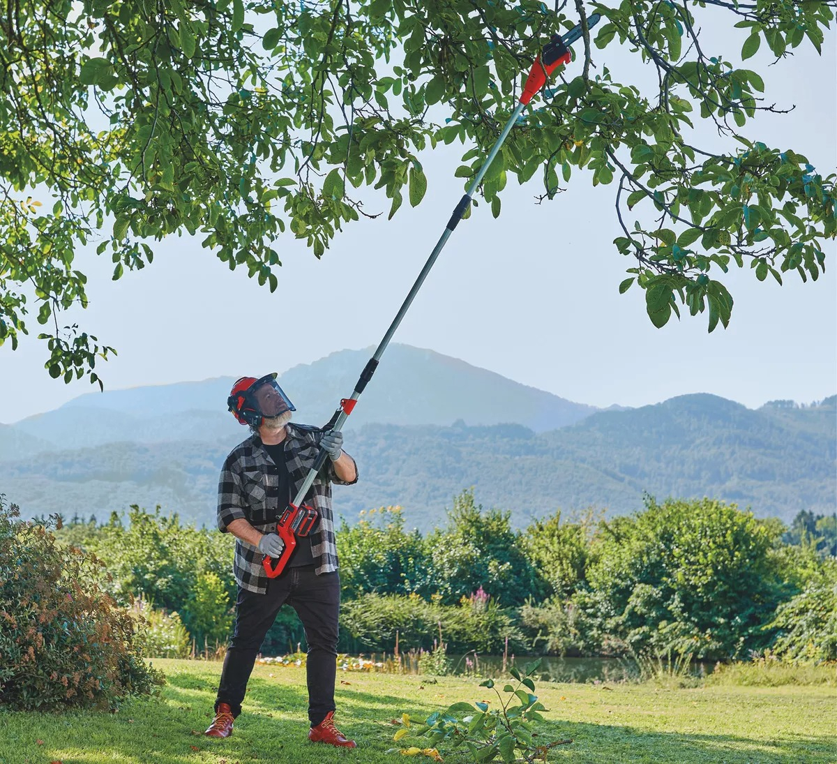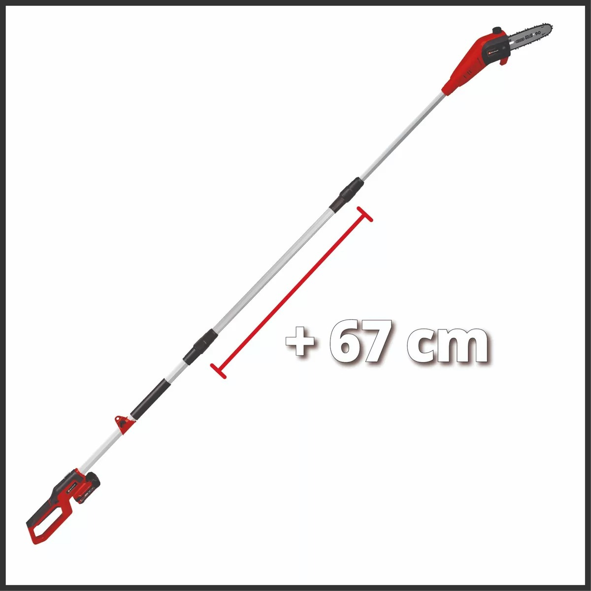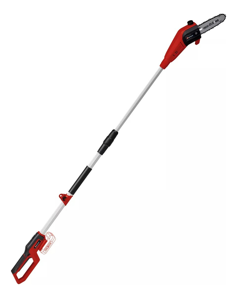 La podadora de pértiga con batería GC-LC 18/20 Li T-Solo de Einhell es ideal para el cuidado regular de árboles y arbustos altos. Es parte de la familia Power X-Change. Con una longitud de espada de 200 mm y una velocidad de corte de 5,5 metros por segundo, permite un corte eficiente de ramas. El cabezal del motor se puede inclinar 30º. La podadora se puede utilizar de manera flexible junto con la varilla de prolongación para alcanzar ramas más elevadas. La superficie de sujeción de goma adicional proporciona un trabajo ergonómico y un sostén fijo y seguro. Además, cuenta con una correa de transporte. El engranaje robusto asegura una larga vida útil. El tope de garra es de metal y dispone de un perno de seguridad de cadena que aumenta la seguridad. La lubricación de la cadena es automática.