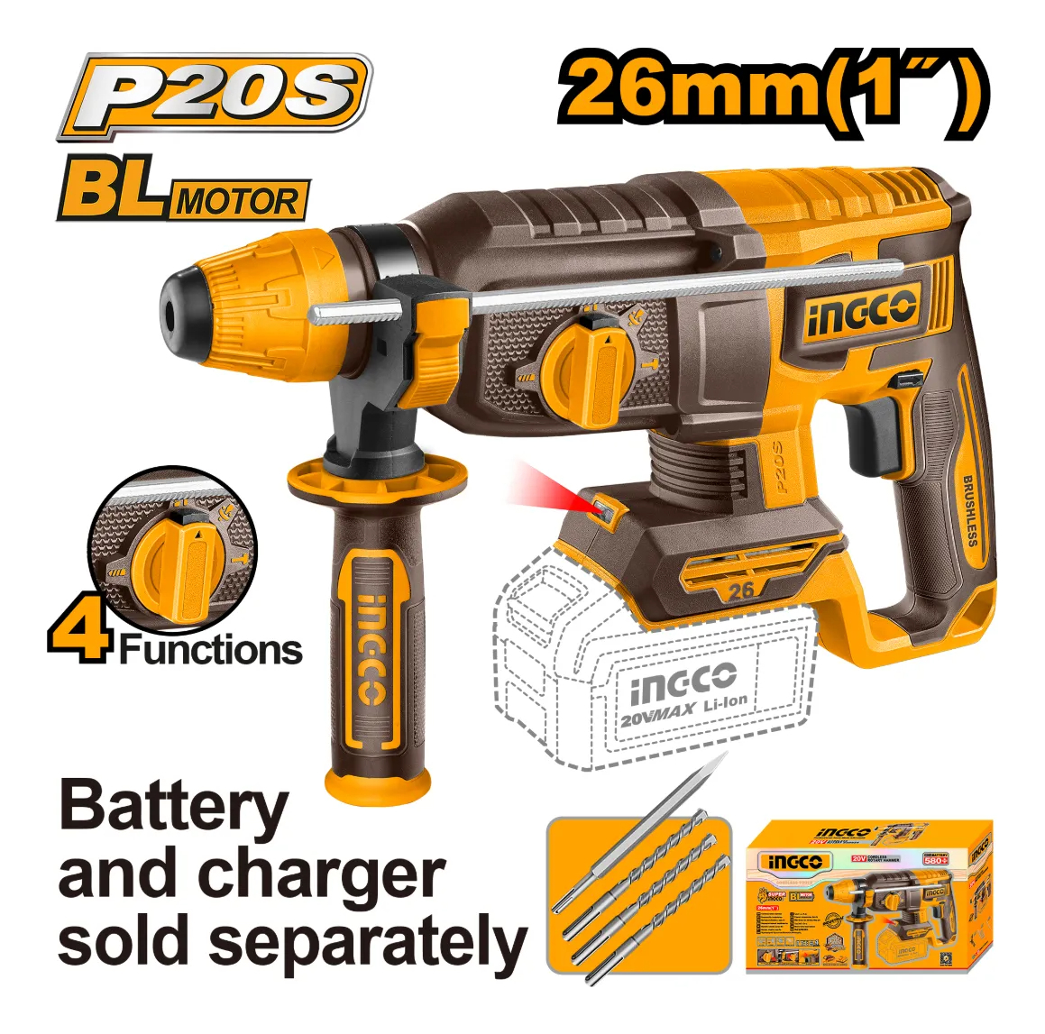 ROTOMARTILLO A BATERIA 26MM P20S 20V SDS PLUS BRUSHLESS MOTOR S/BAT S/CARGADOR