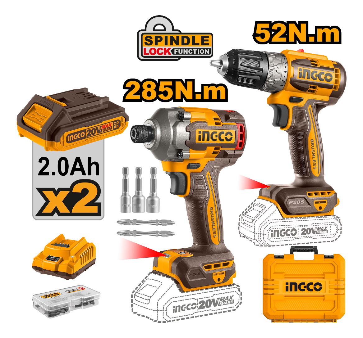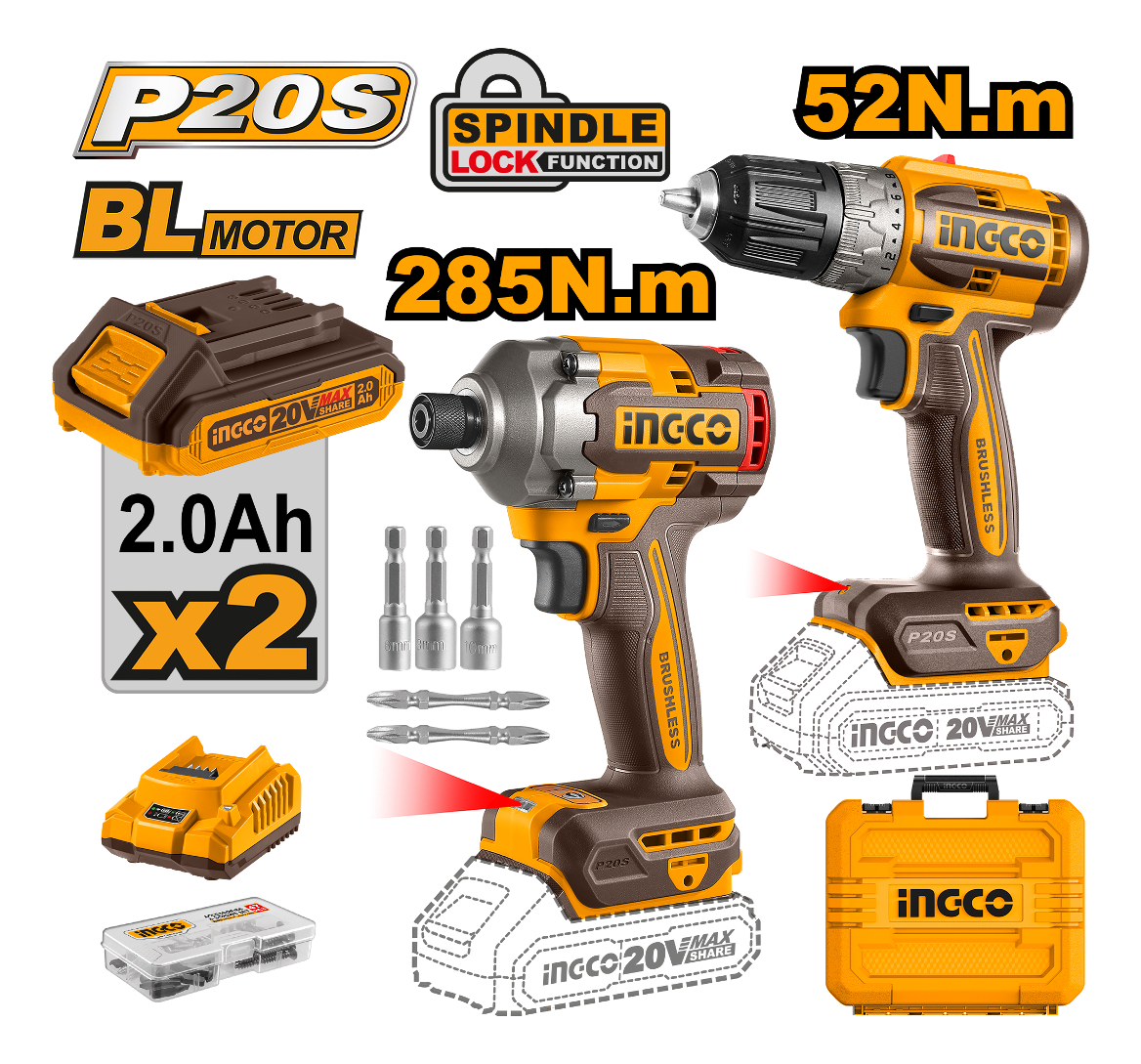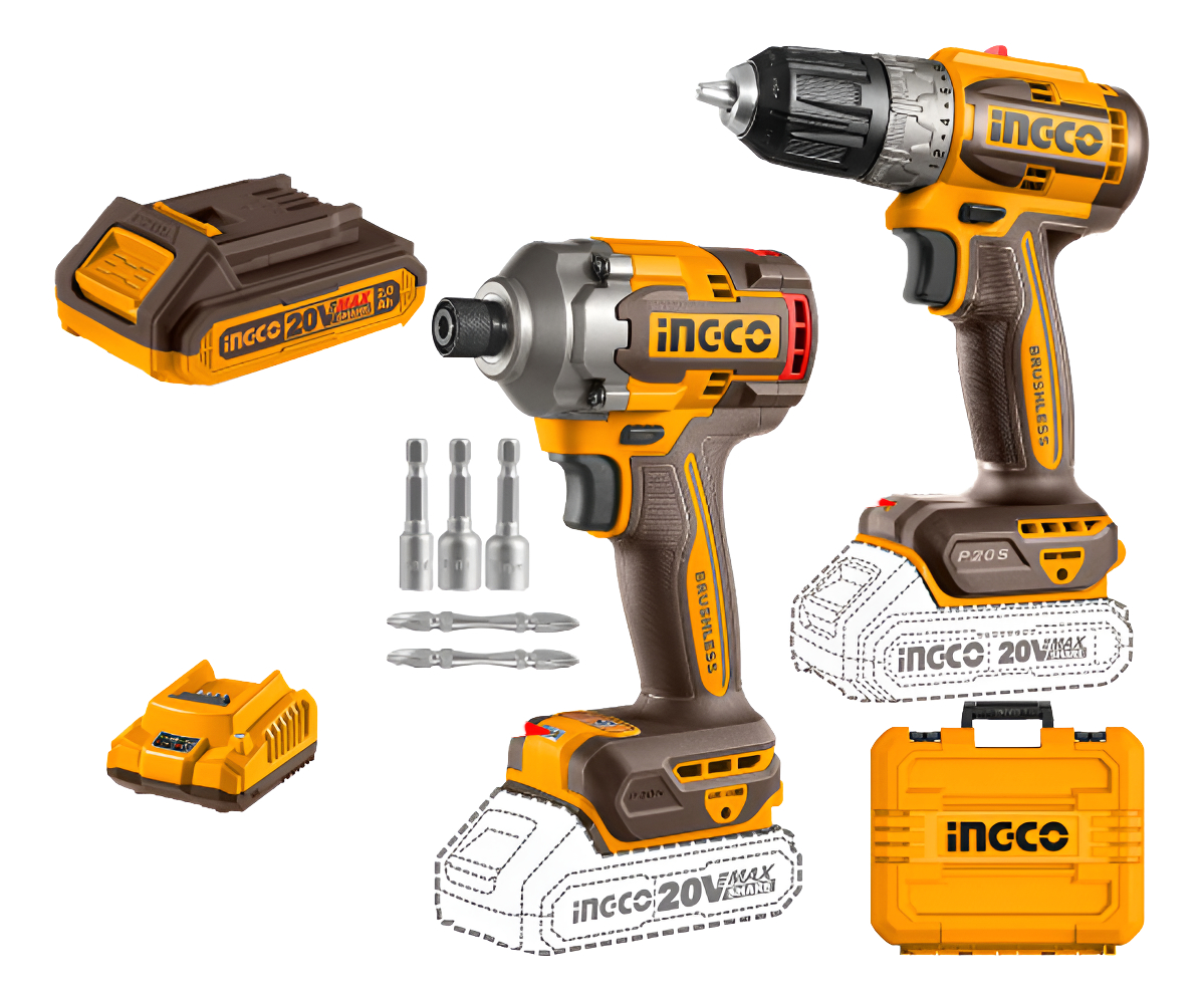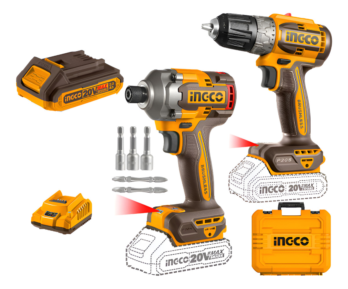 SET ATORNILLADOR DE IMPACTO 20V 285NM + ATORNILLADOR 20V 52NM C 2 BAT CARGADOR + VALIJA INGCO P20S