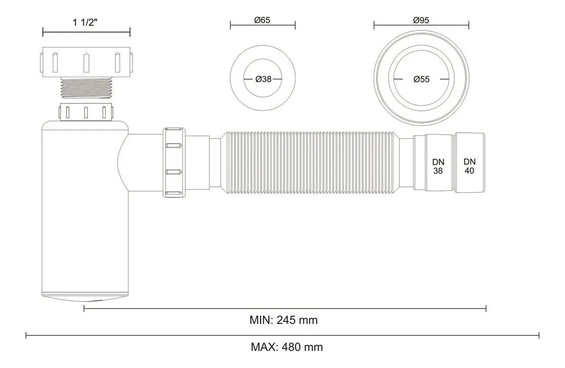 Sifón botella negro universal para bacha, marca Blukit industria brasilera de excelente calidad. Se adapta a cualquier válvula de desagüe y salida.