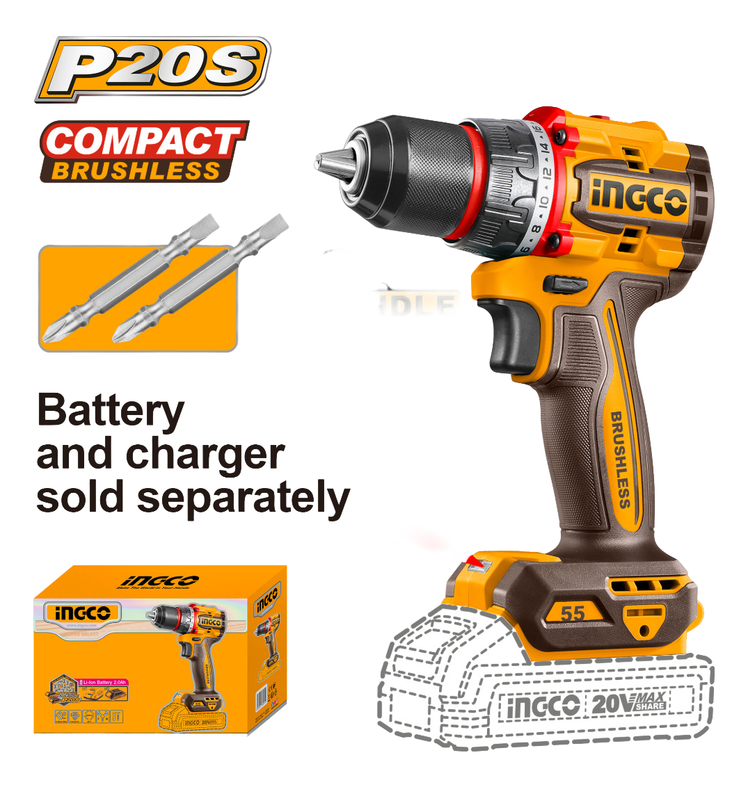 TALADRO ATORNILLADOR A BATERÍA 20V P20S BRUSHLESS 55NM + 2 PUNTAS S/BAT, S/CARG
