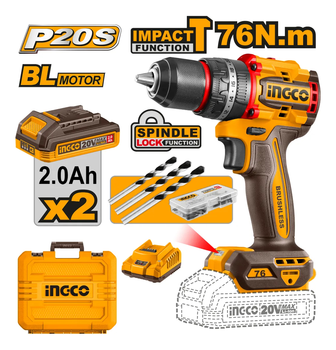 Taladro Atornillador Percutor 76nm Bat/carg Ingco Cidli20768 Amarillo 50/60hz
